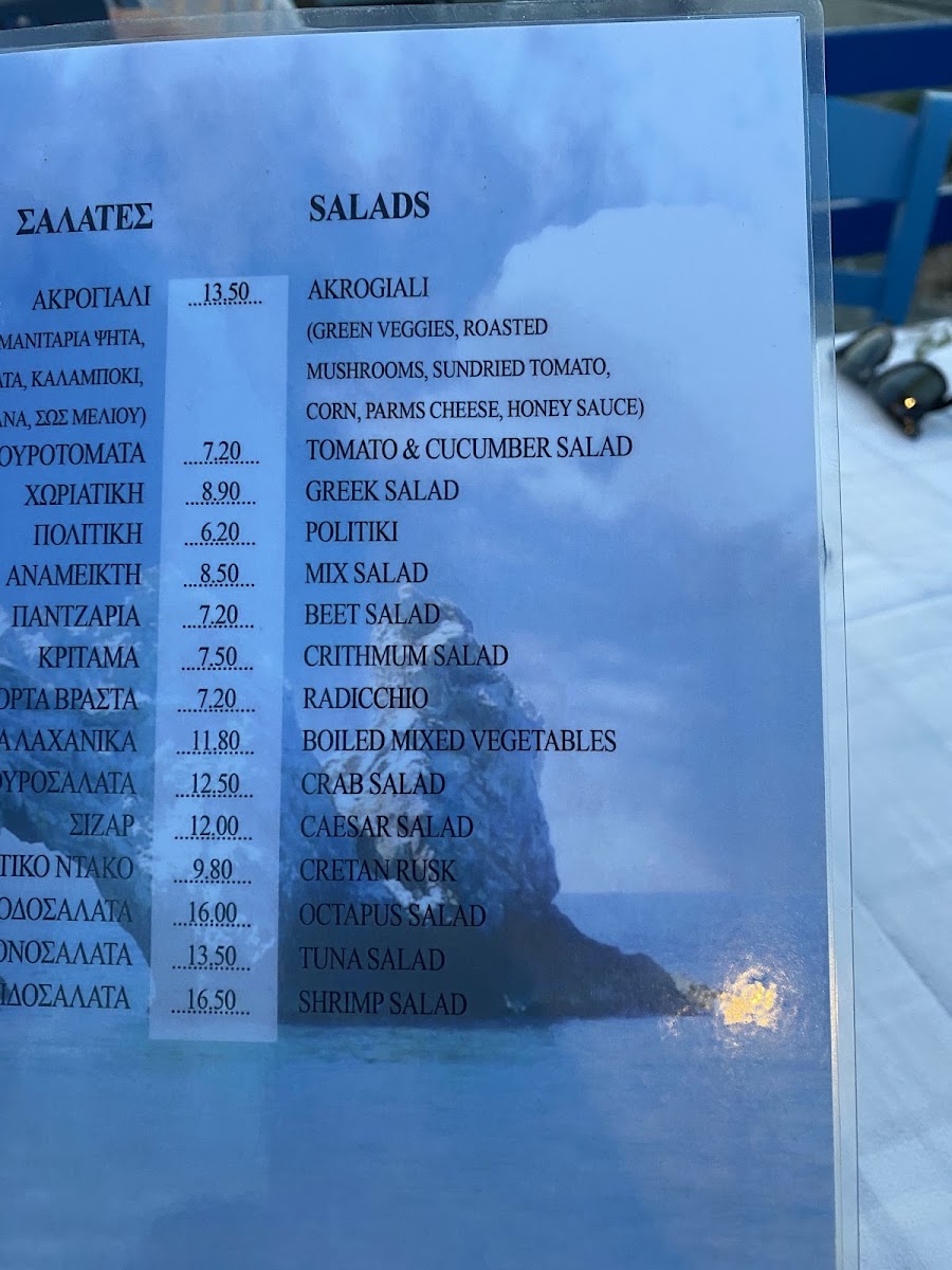 The menu at Akrogiali Tavern reflects its relaxed seaside setting with a focus on fresh, simply prepared Greek and seafood dishes. It offers a range of options from light starters to hearty mains, perfect for casual lunches or unwinding over dinner while watching the sunset by the water.